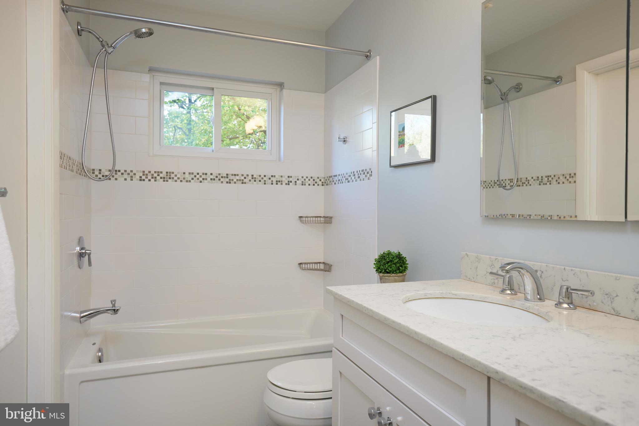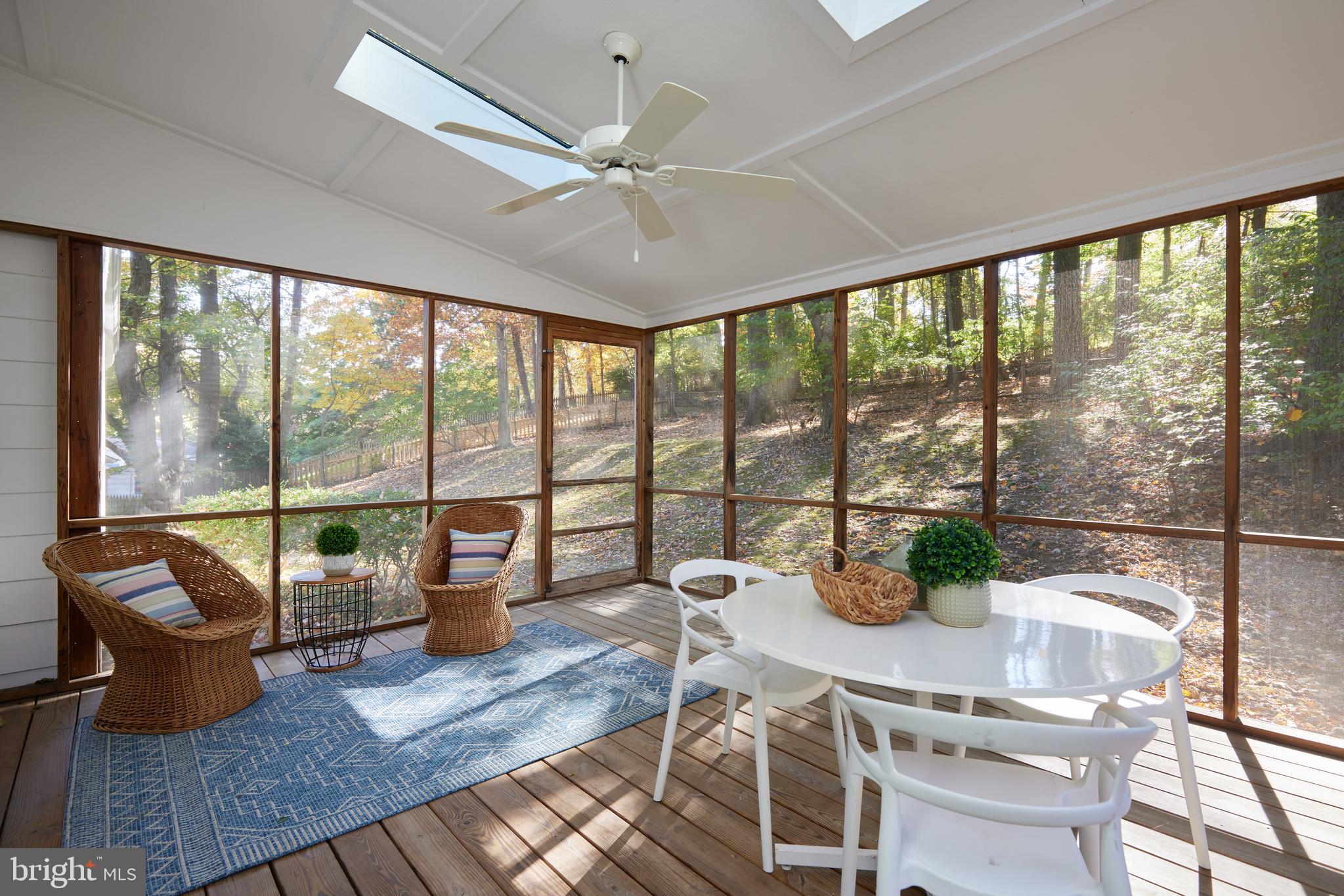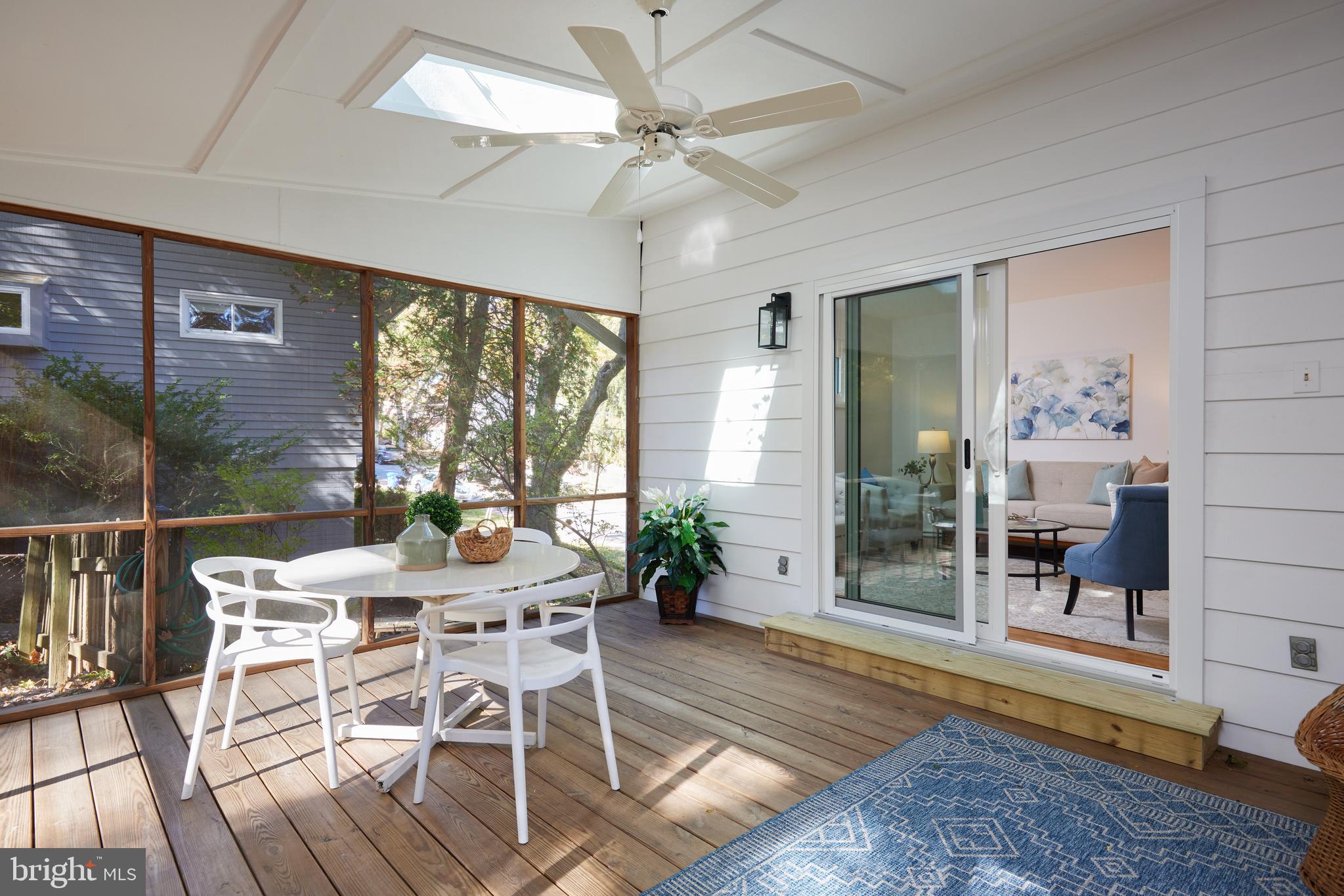 The main level features a sun-drenched living room and dining room with access to the screened-in porch, complete with skylights and a ceiling fan. The remodeled eat-in kitchen offers quartz counters, a GE stainless steel appliance suite, Shaker cabinetry with soft-close drawers, gas cooking with a built-in griddle, and access to the picturesque backyard. Also on the main level are three bedrooms and a renovated dual-entry bathroom, including the sunlit primary bedroom with direct bathroom access and a large wall closet.